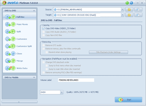 1.2. After the program read your DVD disk, from the options on the left on the interface, select Disk Full, make sure to copy and tick Copy DVD-VIDEO (VIDEO_TS folder), choice DVD5 at the botton options.